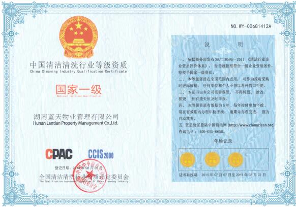 中國(guó)清潔清洗行業(yè)國(guó)家一級(jí)等級(jí)資質(zhì)證書